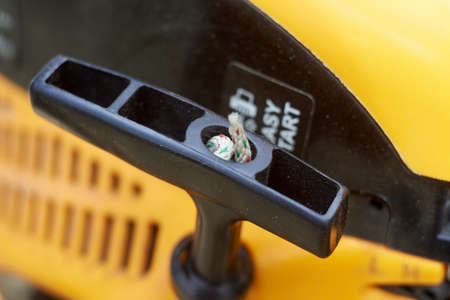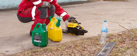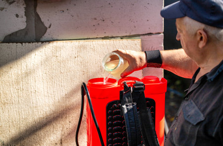 The gardeners hands in protective gloves close the lid of the tank with copper sulphate from a Stihl garden sprayer. Almaty, Kazakhstan - March 23, 2023