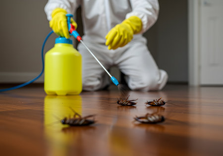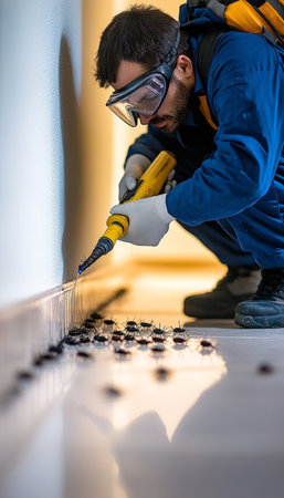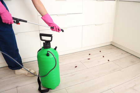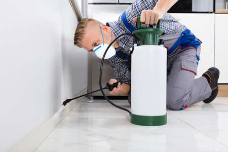 Pest control specialist disinfecting floor for cockroaches in kitchen
