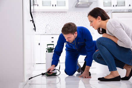 Male Worker Spraying Insecticide Chemical In Front Of Housewife In Kitchen