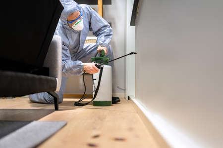 Pest Control Worker in Blue Uniform Spraying Insecticide for Cockroach Treatment, Home Pest Control