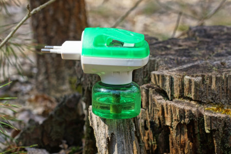 one electric plastic fumigator with a bottle of liquid from mosquitoes and insects stands on a gray stump in nature