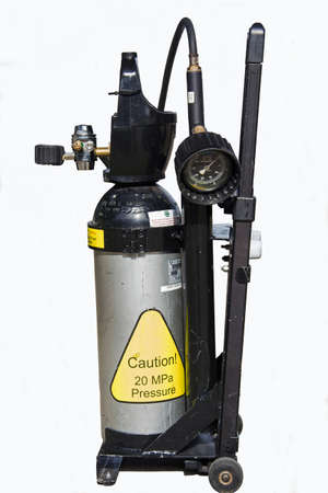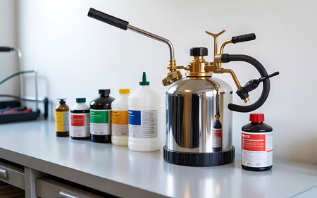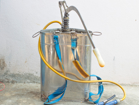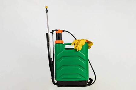 Yellow industrial sprayer with a green lid for spraying water in the workshop for pasting film on a white background. Tool for irrigation fluid.