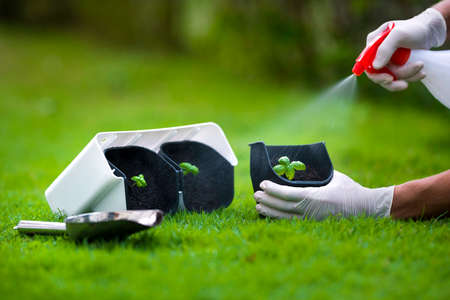 Spray bottle with pesticides close-up. An exterminator in work clothes sprays pesticides from a spray bottle. Fight against insects in apartments and houses. Disinsection of premises.
