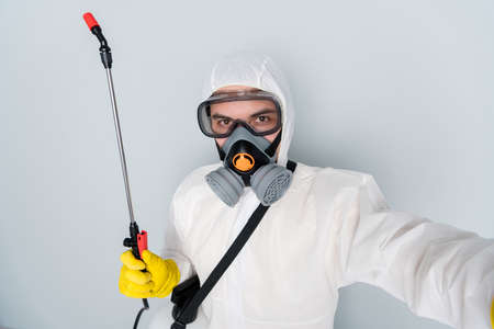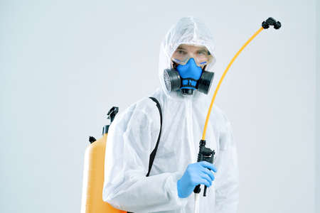 Portrait of a man in a yellow chemical protection suit holding a sprayed disinfectant.