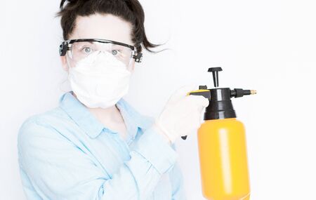 Woman in protective mask and glasses with a spray, theme of hygiene and protection against coronavirus, covid-19