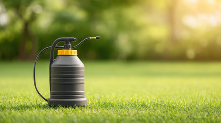 A black garden sprayer with a yellow cap is placed on lush green grass under warm sunlight, showcasing an ideal setting for gardening and lawn care activities.