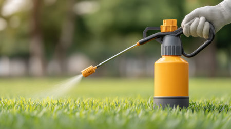A gardener in gloves uses a sprayer to apply liquid fertilizer to a vibrant green lawn, promoting healthy growth under bright sunlight in a beautiful outdoor setting.