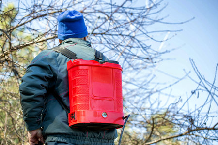 A worker sprays pesticides on trees outdoors. Tree pest control.