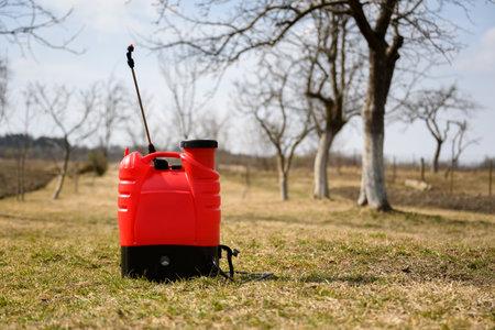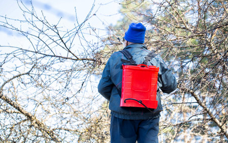 A man with a red electric sprayer treats trees and bushes in a garden on a summer cottage. Treatment of trees in spring.