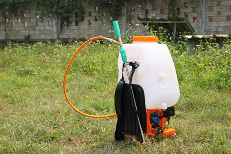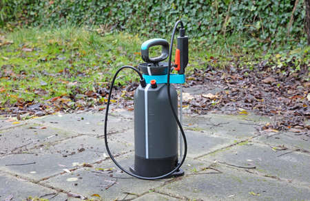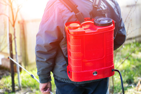 A male gardener with a red electric sprayer sprays bushes from pests in the spring.