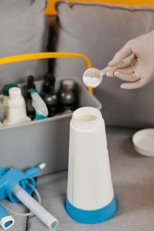 Man wearing mask and gloves, using detergent for making cleaning at home.