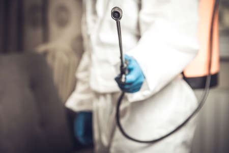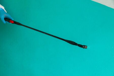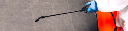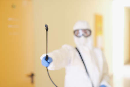 Spray gun with pesticides close-up. An exterminator in work clothes sprays pesticides from a spray bottle. Fight against insects in apartments and houses. Disinsection of premises.