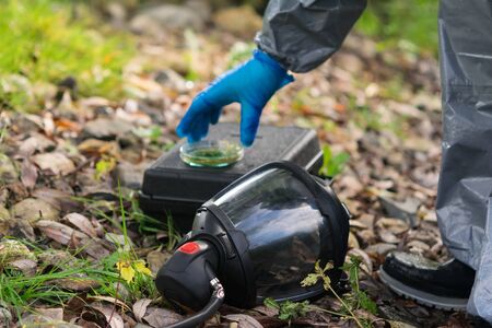 hand in a protective suit and a rubber glove takes a mask to protect respiratory organs from the ground