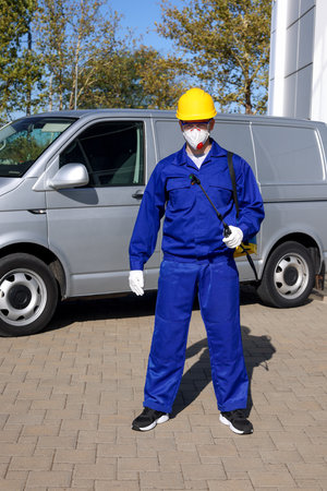 Disinfection service worker puts a spray equipment into a vehicle's trunk. A man wearing protective suit, mask and gloves takes out a sanitary spray from a car. Cleaning and covid-19 prevention