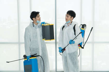 Professional male worker In protective clothing and masks are spraying disinfectants, cleaning, controlling virus and bacteria in the contaminated area After the spread of coronavirus or COVID-19