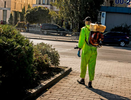 COVID-19 and disinfection. Disinfection specialist, a medical worker in a protective suit processes surfaces on the street using special equipment.
