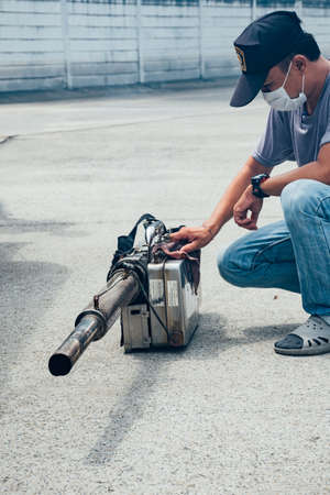 Man work fogging to eliminate mosquito for preventing spread dengue fever in Thailand.