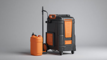 Watercart on wheels, portable watering system on pedestrian street, close up