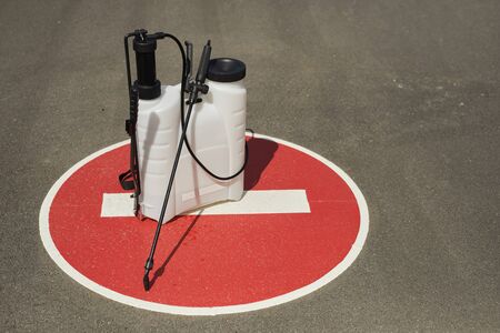 Background image of disinfection equipment standing on red STOP sign outdoors in sunlight, cleaning and prevention concept, copy space