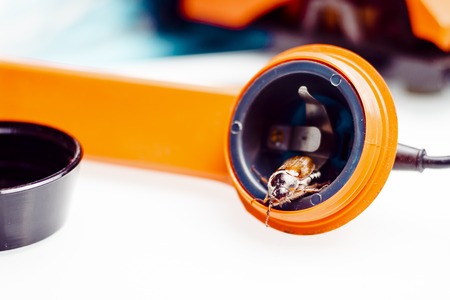 Mosquito lamp at work for the extermination of insects on cafe terraces. Background with selective focus and blurred background