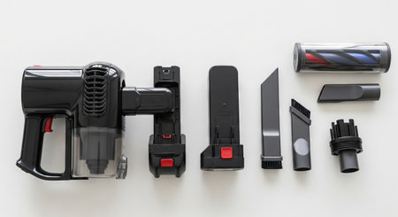 Cordless handheld vacuum cleaner body with various attachments and battery pack. Modern household cleaning appliance. Organized flat lay.