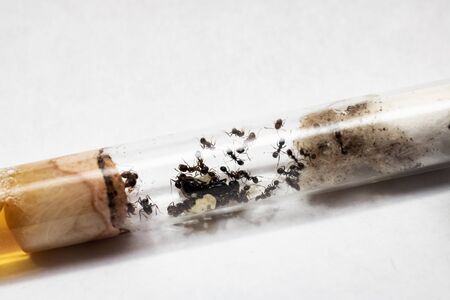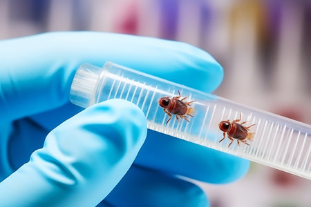 A test tube with two bed bugs in the hands of an entomologist in blue gloves. horizontal photo