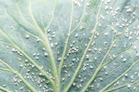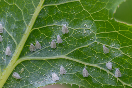 Underside of plants leaves with pest Cabbage Whitefly Aleyrodes proletella adults and larvae on the underside of the leaf. Itis a species of whitefly from the Aleyrodidae family, pest of many crops.