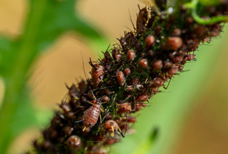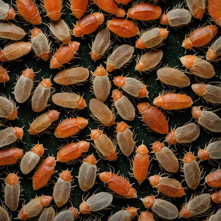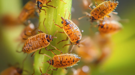 A detailed macro shot of tiny orange insects gathered on a green plant stem, showcasing the intricate patterns and textures of nature. Perfect for educational use.