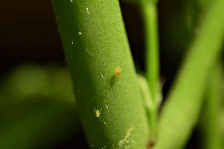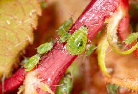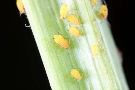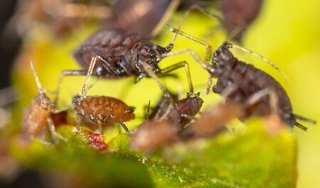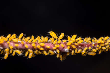 Black aphid on the grass or stem. Family of aphis damaging garden