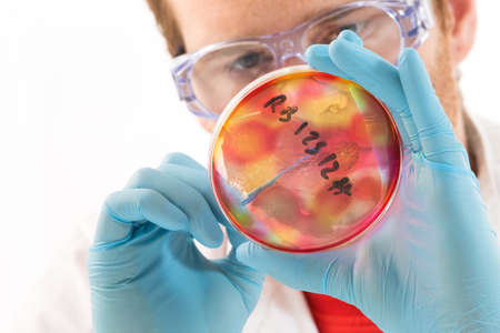 microbiologist hand cultivating a petri dish whit inoculation loops
