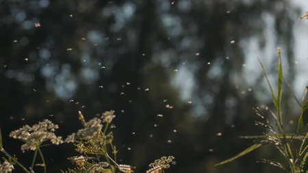 Insects on the background of river. Mosquitoes near the river in Latvia. Abstract background of insects and river; Insects in spring, Latvia. Flying insects on dark river background.