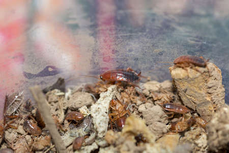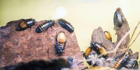 Macro Creepy close up of a lot of Harlequin cockroach (Neostylopyga rhombifolia). Tropical insect on wood branch . Common household bugs crawling . Dirty disgusting gross insect hygiene concept.