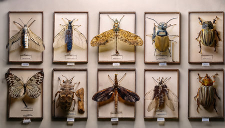 Vividly colored insect specimens in shadow boxes, highlighting their unique features.