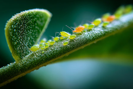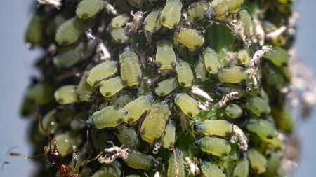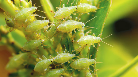 A detailed close-up photograph showcasing green aphids clustered on a plant stem, highlighting their biology and interaction with nature. Perfect for educational and scientific use.