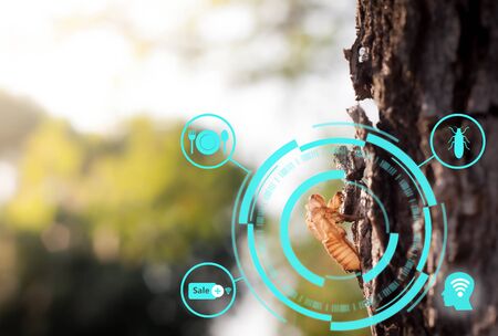 Smart technology with Internet of things futuristic agriculture concept. Analysis report with one finger click on digital screen. free space for text. Blurred gentle artistic nature background
