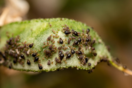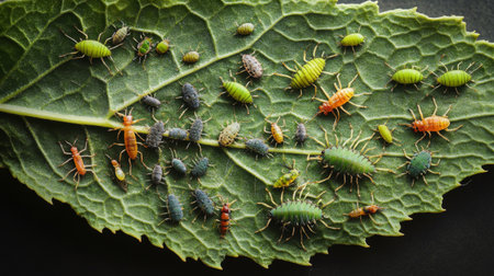 This close-up image showcases a cluster of black aphids on a vibrant green leaf, illustrating the challenges of pest control in gardens and agriculture.