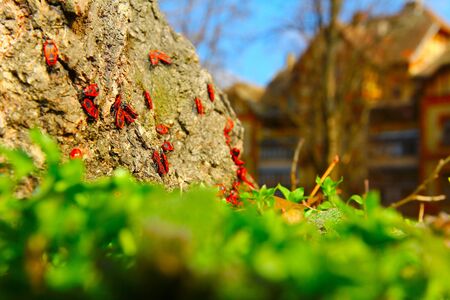 colony of red beetles came out the spring sunbathing at the foot an old oak