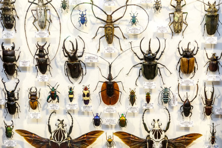 Moscow, Russia - March 12, 2019: Collection of dried natural insects in the Apothecary garden. Set of pin insect in biology museum. Zoology background