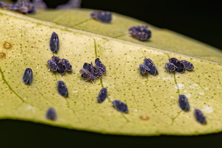 A detailed close-up of black aphids crawling on a vibrant green leaf, showcasing their tiny size and natural habitat in an outdoor environment, perfect for nature studies.
