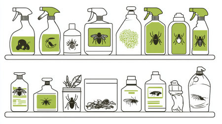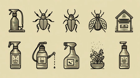 A collection of vintage-style illustrations showcasing various insects and pest control sprays. Ideal for pest management resources and educational materials.
