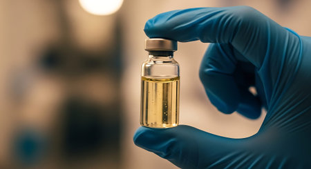 A gloved hand holding a small glass vial with a yellow liquid, likely in a laboratory setting. The background is blurred, focusing on the vial.