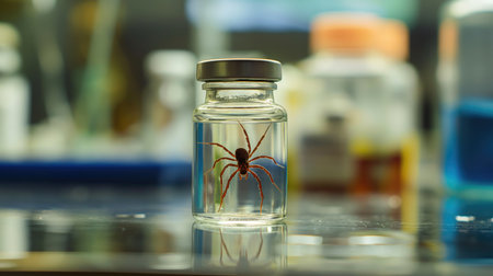Dangerous spider in vial and test-tubes in medical laboratory. Dangerous animal.