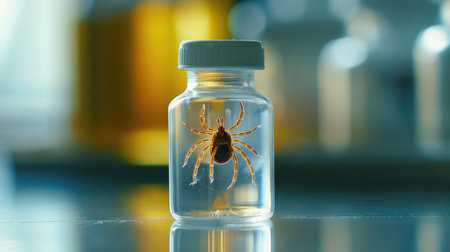 Dangerous tick insect in vial and test-tubes in medical laboratory. Dangerous animal.