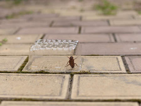 cockroach was trapped under transparent plastic container. outdoors. preventing appearance of dangerous insects in the house.
