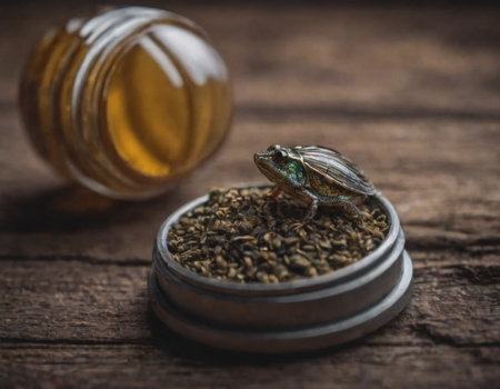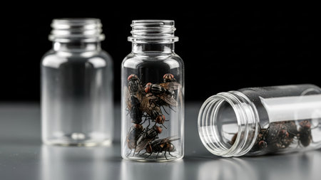 Glass bottles containing preserved insects on reflective surface