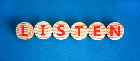 Listen symbol. Concept Listen word on beautiful wooden circles. Beautiful blue background. Business education listen concept. Copy space.