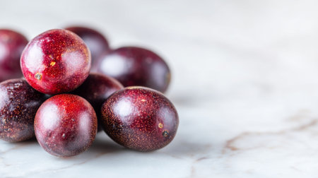 A collection of fresh red fruits arranged on a marble surface, showcasing vibrant colors and textures. Ideal for health, culinary, and food presentation themes.