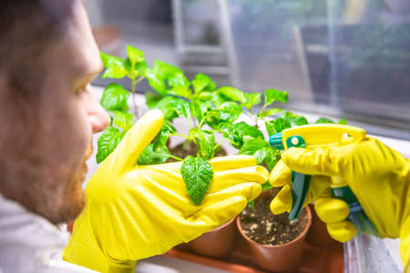 Man scientist gardener, smiling with gloves, processes the seedlings, sprays the leaves with fertilizers and fights against infectious diseases, fungi grown under artificial lighting in a greenhouse