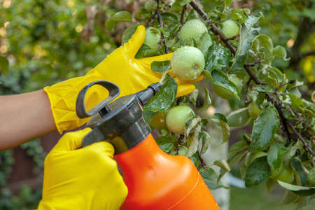 Gardener applying insecticidal fertilizer for fruit apples and protects against fungus, aphids and pests using sprayer