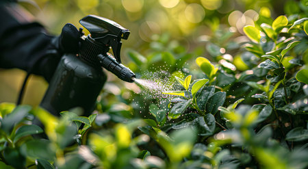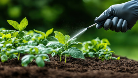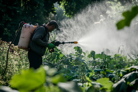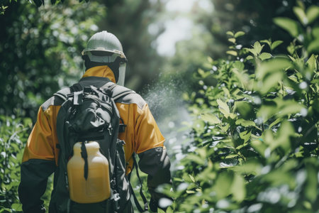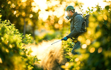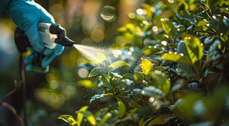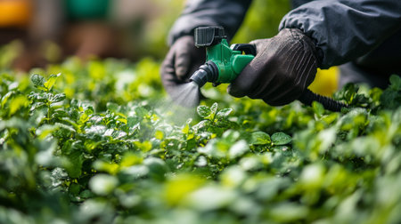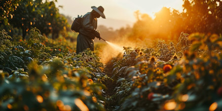 Amidst vibrant greenery, a gardener diligently sprays a mist over crops, ensuring their protection and health. The soft light of morning casts a serene atmosphere on this agricultural scene.